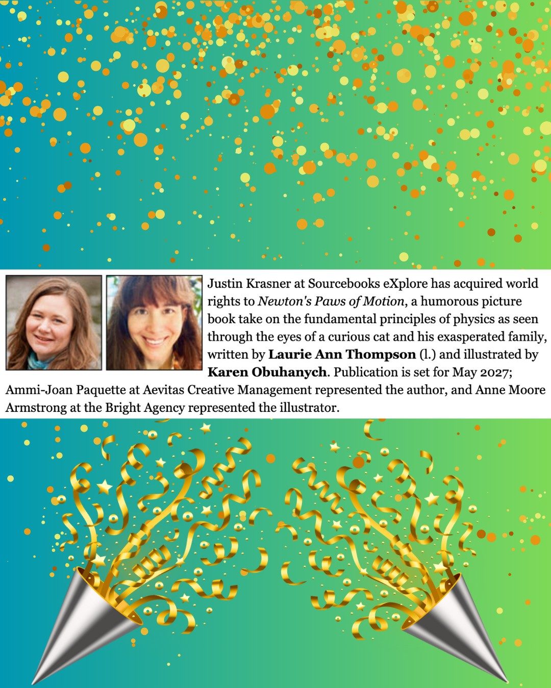 I’m thrilled to share my latest book deal, a humorous STEM picture book inspired by my very own cat (and his “experiments”). This one teaches young readers about Newton’s Laws of Motion through the eyes of a curious, science-loving feline and his less-than-enthusiastic family. I feel so lucky to get to collaborate on it with Justin Krasner and Karen Obuhanych (go look up her cat illustrations right now): I’m still pinching myself! Alas, we’ll all have to wait until May 2027 to see the final product.